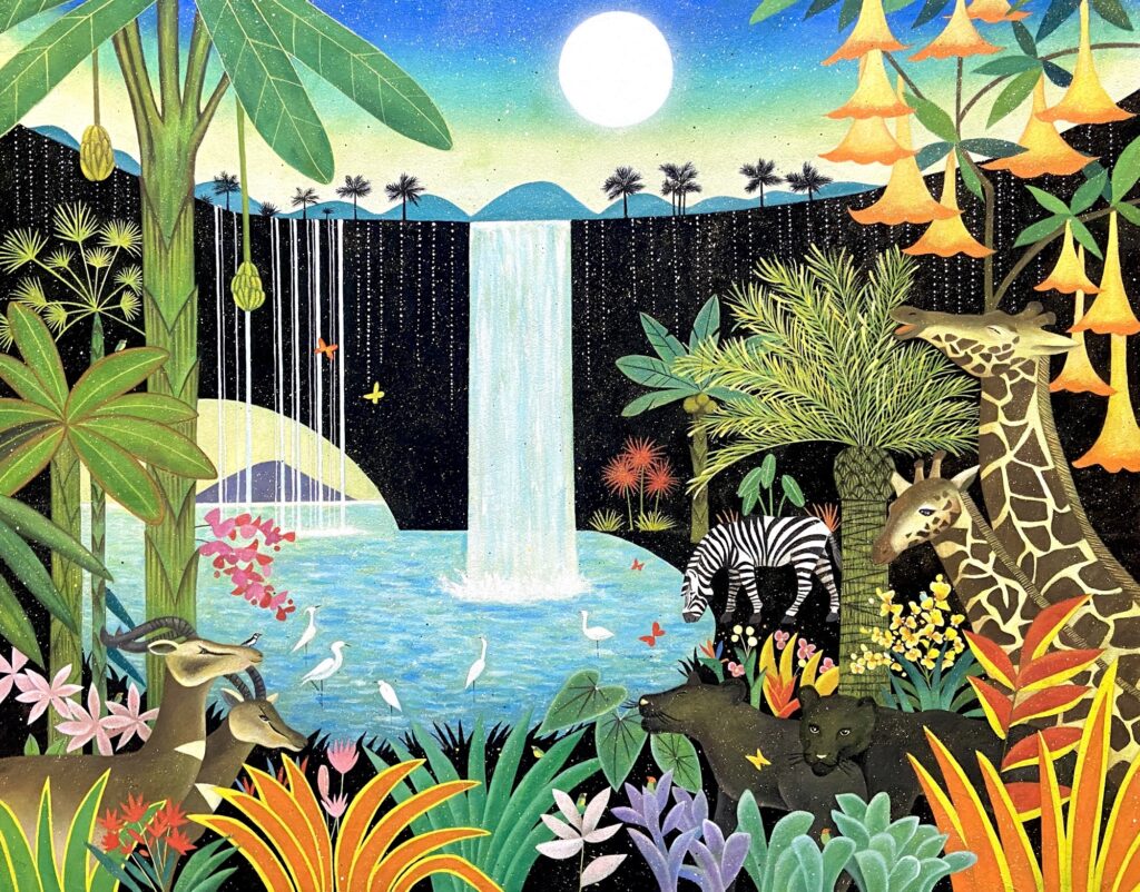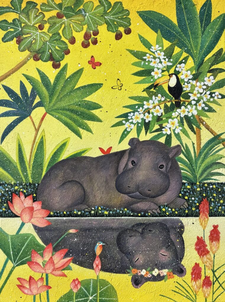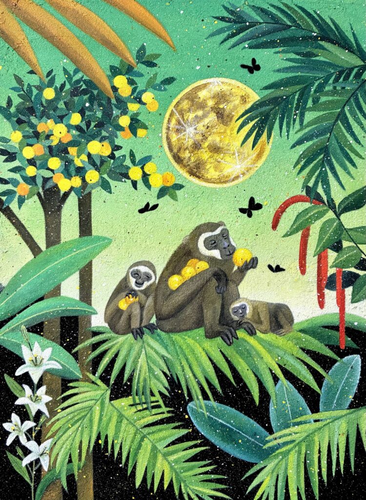 今回の展示では、花々や果実、動物たちが共に過ごす穏やかな世界を描いています。